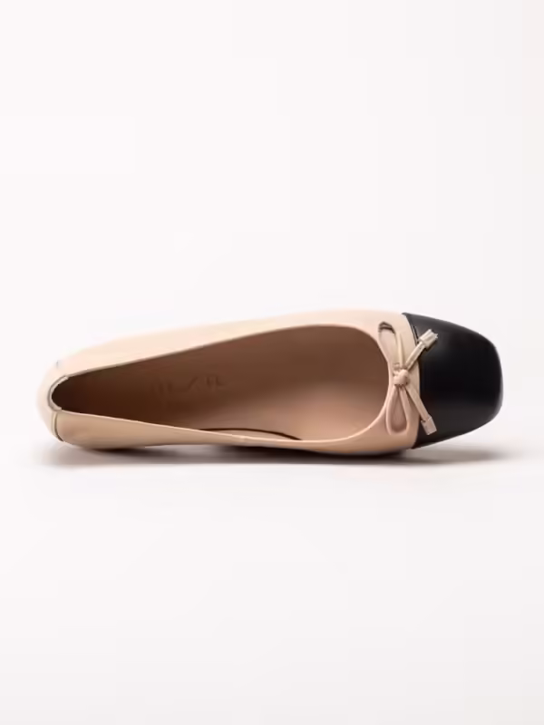 Snygg kontrast med svart tåparti och dekorativ rosett framtill.