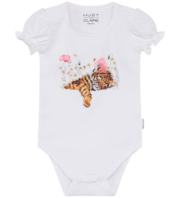 Hust and Claire body i vit med ett sött tryck av en liten tiger i bruna, gröna och rosa nyanser.